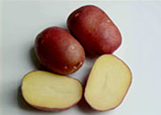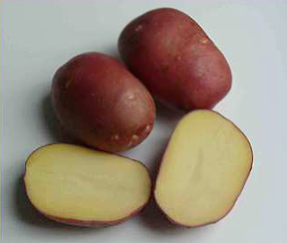 Клубни - имеют форму круглого овала, окрашены в красный цвет. Мякоть белая. Картофель имеет длительную лежкость.